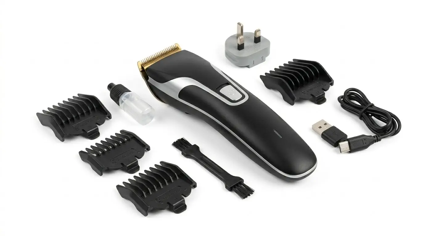 Titanium-coated blades, rechargeable battery, adjustable cutting lengths, includes guide combs.