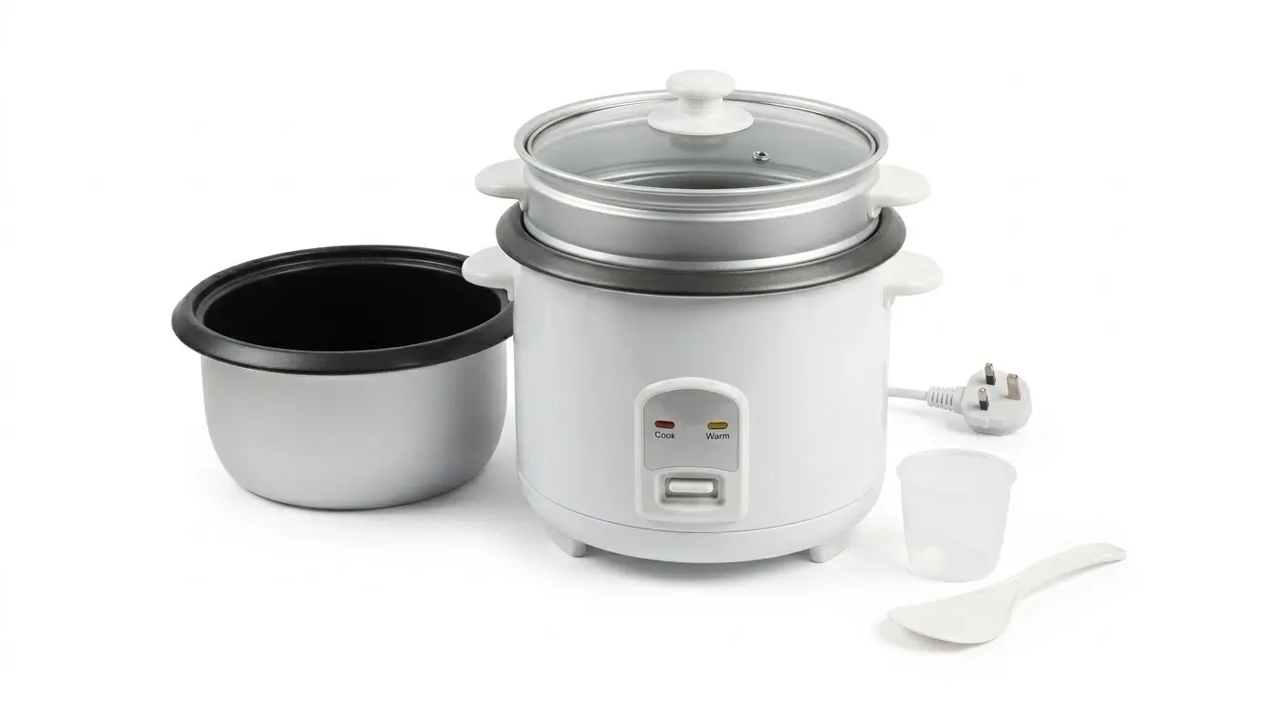 1.8-liter capacity, automatic keep-warm function, non-stick inner pot, includes steamer basket.