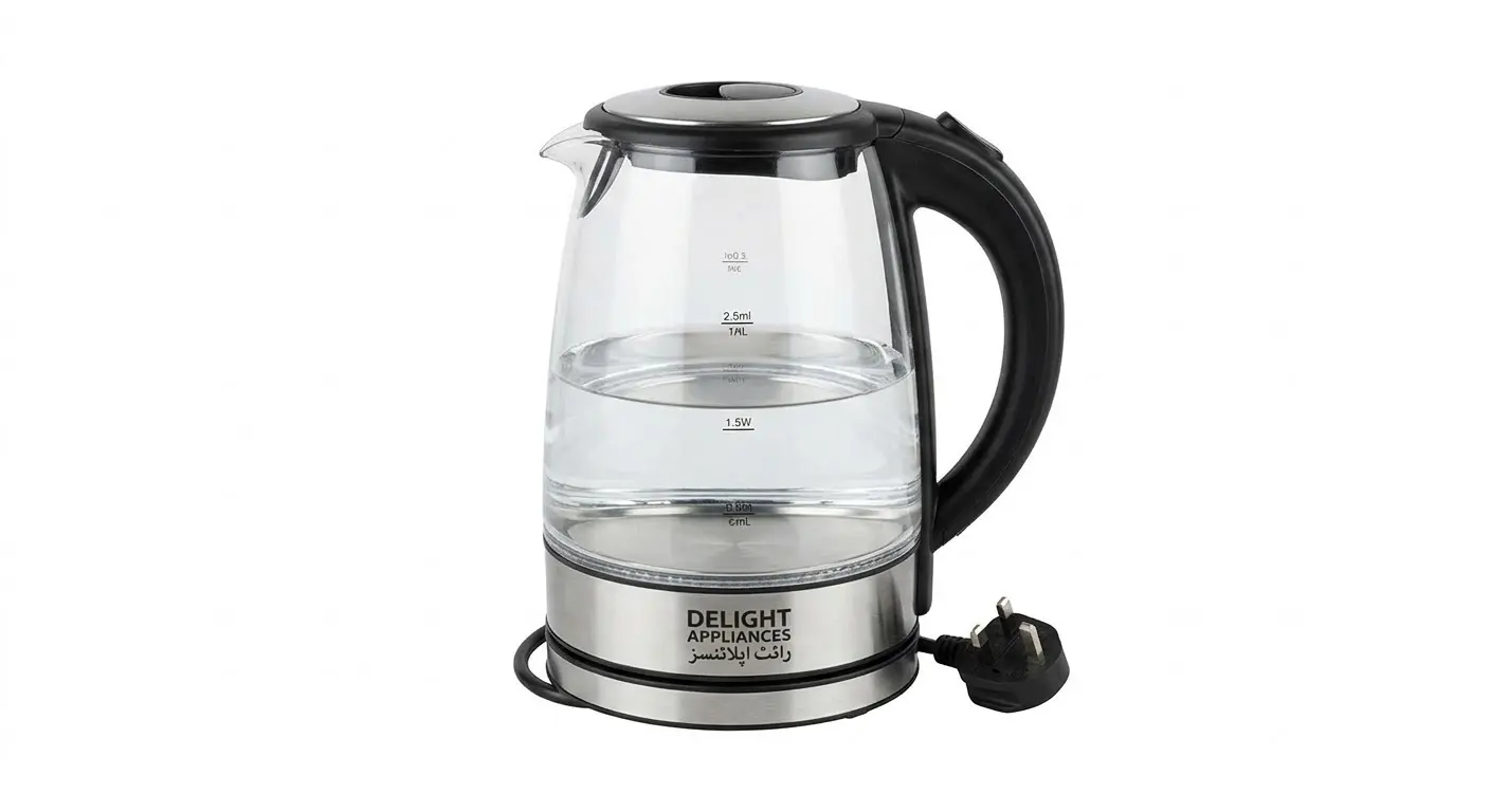 Borosilicate glass body, blue LED boil indicator, 1.8L capacity, automatic shut-off.