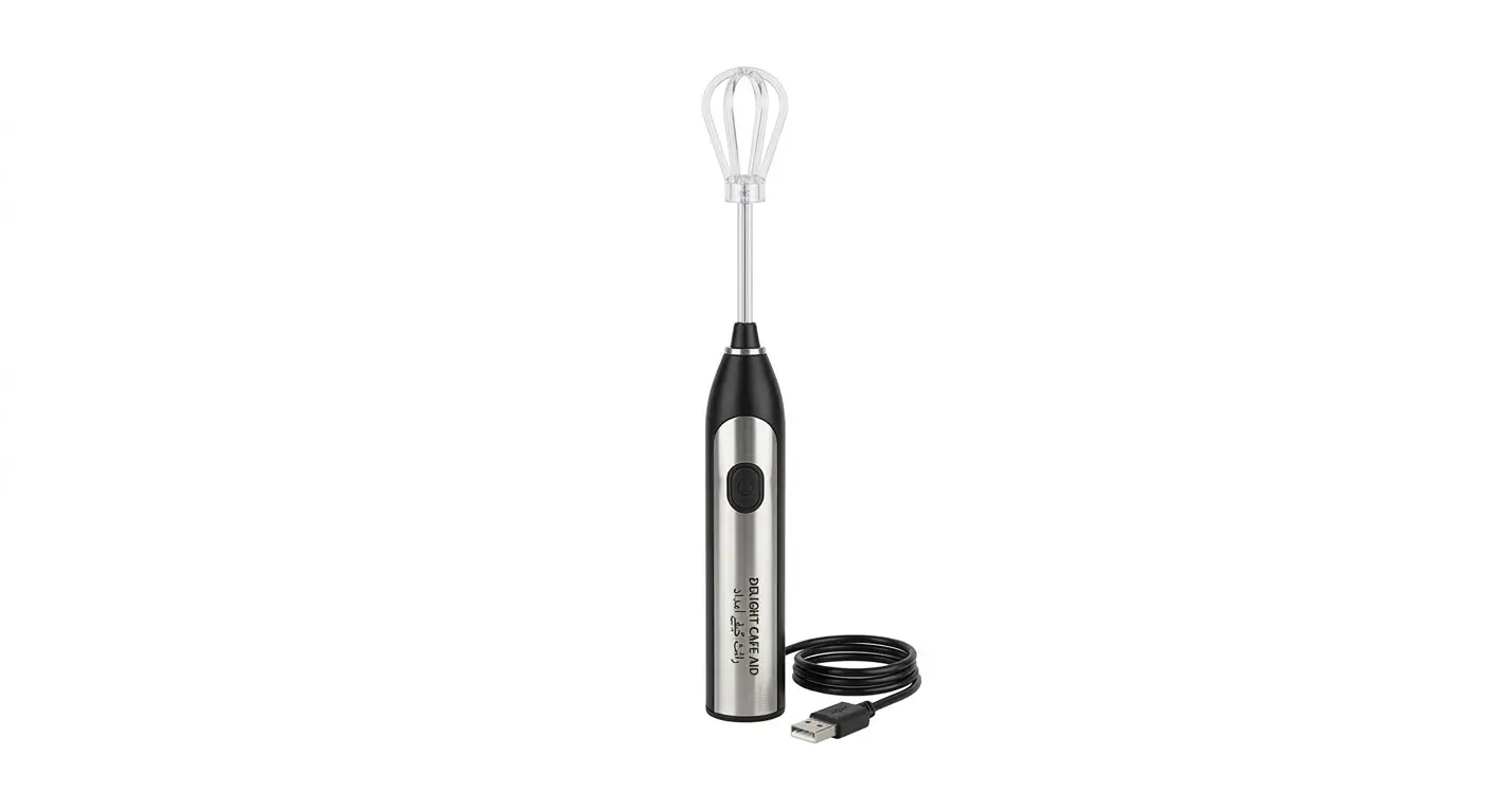 Battery operated, stainless steel whisk, ergonomic grip, creates foam for lattes and cappuccinos.